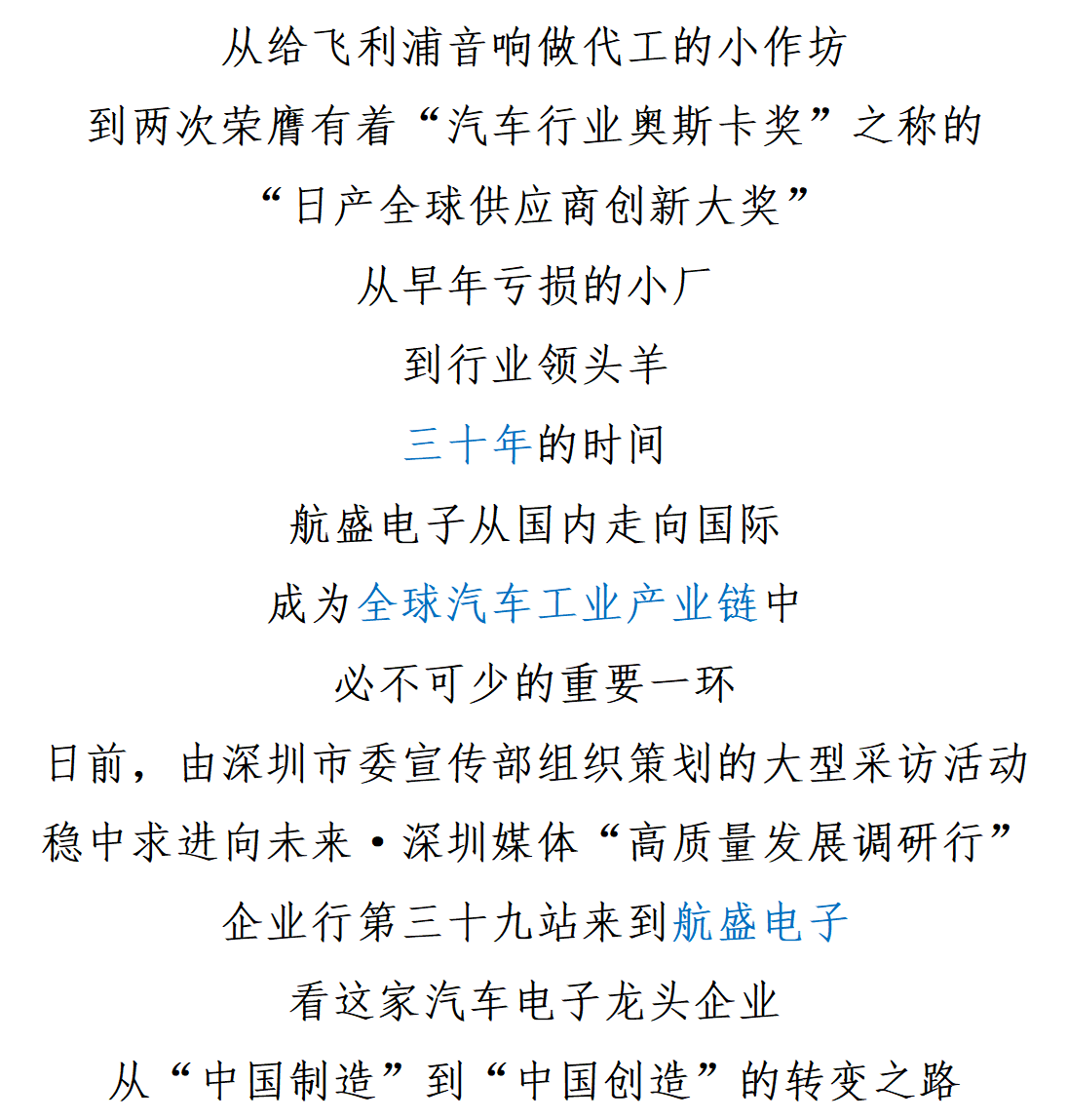![]() 一线调研 航盛电子:坚持长期主义做����� �������Ƴ������������ �������Ƴ������������ �������Ƴ������������ �������Ƴ�������汽车电子“百年老店” ![]() 30年的发展风雨兼程,立足于深圳这座改革开放����� �������Ƴ������������ �������Ƴ������������ �������Ƴ������������ �������Ƴ�������窗口城市,航盛电子从国内走向国际,����� �������Ƴ������������ �������Ƴ����������� �������Ƴ������������ �������Ƴ������成为全球汽车工业产业链中����� �������Ƴ������������ �������Ƴ������������ �������Ƴ������������ �������Ƴ�������必不可少的重要一环。 高质量发展调研行之航盛集团 从一家濒临倒闭的电子音响厂到中����� �������Ƴ������������ �������Ƴ������������ �������Ƴ������������ �������Ƴ�������国汽车电子行业龙头企业,航盛通过持续的高研����� �������Ƴ������������ �������Ƴ����������� �������Ƴ������������ �������Ƴ�������发投入,用30年创造了中国汽车电子行业的“深圳����� �������Ƴ����������� �������Ƴ������������ �������Ƴ������������ �������Ƴ�������奇迹”。 对话企业家 杨洪:强化技术攻关优化湾区����� �������Ƴ������������ �������Ƴ������������ �������Ƴ������������ �������Ƴ�������汽车产业生态 ![]() 杨洪表示,高质量发展离不开创新。在他看����� �������Ƴ����������� �������Ƴ������������ �������Ƴ������������ �������Ƴ�������来,企业核心发展动能是由科技创新催生的����� �������Ƴ������������ �������Ƴ������������ �������Ƴ������������ �������Ƴ�������。航盛的高质量发展,离不开依靠创新����� �������Ƴ������������ �������Ƴ������������ �������Ƴ����������� �������Ƴ�������驱动的内涵型增长。 专家观点 朱方来:坚持工匠精神走自主创新之路 ![]() 朱方来表示,深圳提出“工业立市”“����� �������Ƴ������������ �������Ƴ����������� �������Ƴ������������ �������Ƴ������制造强市”,推动制造业高质量发展,才能在产业链上����� �������Ƴ������������ �������Ƴ������������ �������Ƴ������������ �������Ƴ�������占领先机、赢得优势和未来。����� �������Ƴ������������ �������Ƴ������������ �������Ƴ������������ �������Ƴ�������这就需要不断优化产业链布����� �������Ƴ����������� �������Ƴ������������ �������Ƴ������������ �������Ƴ�������局、增强科技创新支撑、完善资源要素配置,推动产学����� �������Ƴ������������ �������Ƴ����������� �������Ƴ������������ �������Ƴ�������研交流合作,全方位提升产业的全球竞����� �������Ƴ������������ �������Ƴ������������ �������Ƴ����������� �������Ƴ�������争力。 一线观察 企业高质量发展要“智”“质” 并重 ![]() 作为中国汽车电子龙头企业,航盛电子肩负的使命不����� �������Ƴ����������� �������Ƴ����������� �������Ƴ������������ �������Ƴ������单是把产品和服务做好,还要不懈探索高质量的标准。����� �������Ƴ������������ �������Ƴ������������ �������Ƴ������������ �������Ƴ������� |